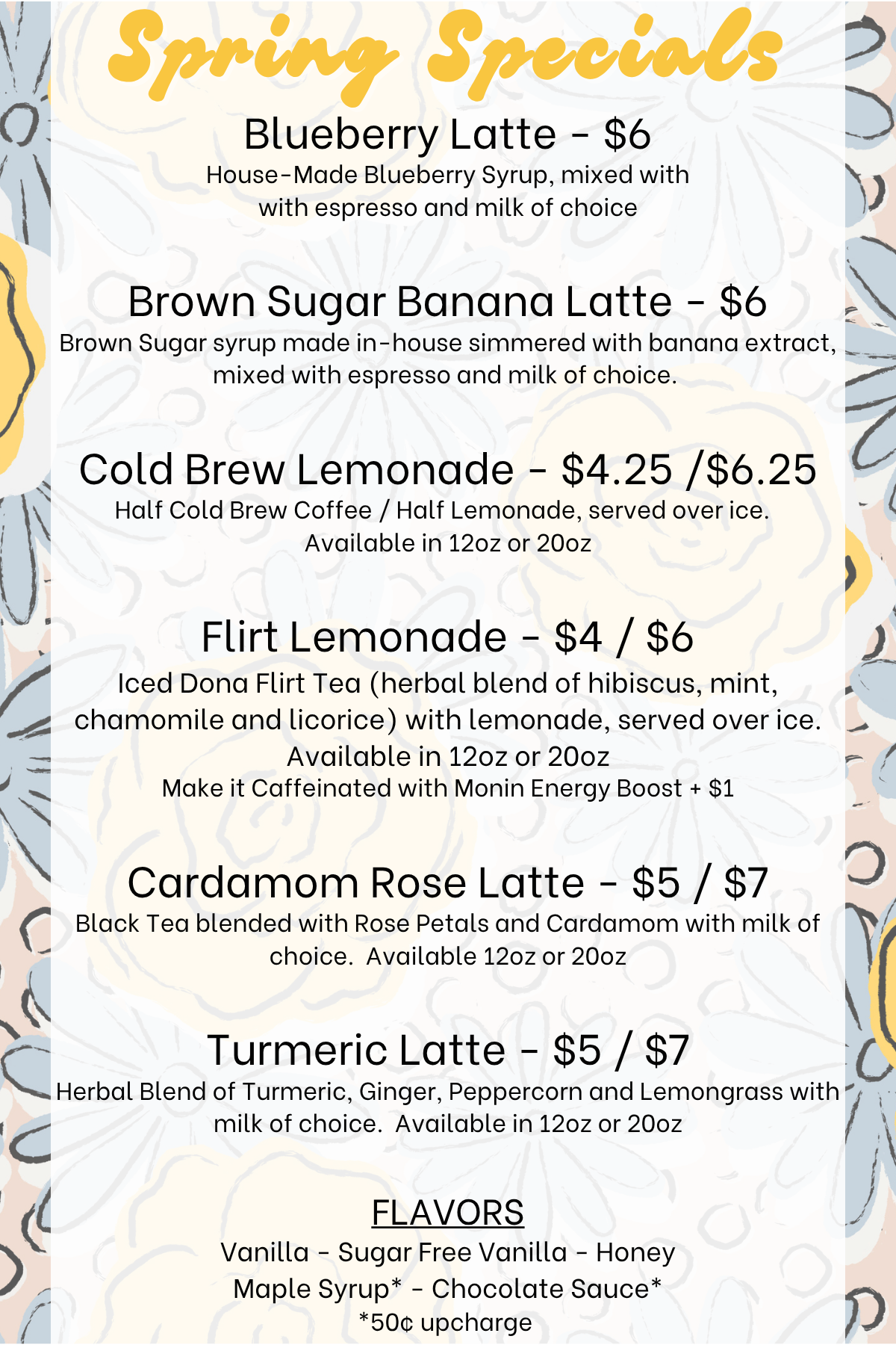 coffee sourced from:Variety Coffee Roasters in brooklyn, NY Assorted pastries available daily from:Fig Tree Patisserie in Kenmore, NY Bagels From Breadhive in Buffalo, NY :Plain - Everything - Rosemary + Sea Salt - pretzel Assorted beverages in our retail fridge from:harney & sons - heywell - katboocha - lucky frog - poppi& More! VARIOUS Grab + GO lunch options Made in-house