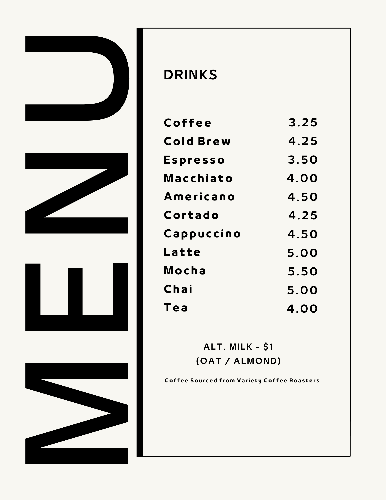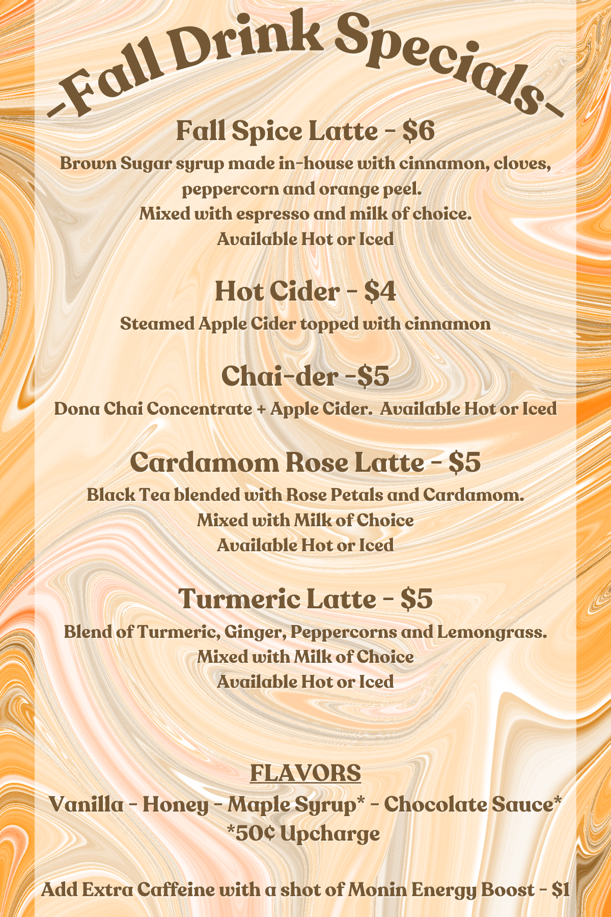 coffee sourced from:Variety Coffee Roasters in brooklyn, NY Assorted pastries available daily from:Fig Tree Patisserie in Kenmore, NY Bagels From Breadhive in Buffalo, NY :Plain - Everything - Rosemary + Sea Salt - pretzel Assorted beverages in our retail fridge from:Cloudwater - harney & sons - heywell - katboocha - lucky frog - poppi& More! VARIOUS Grab + GO lunch options Made in-house